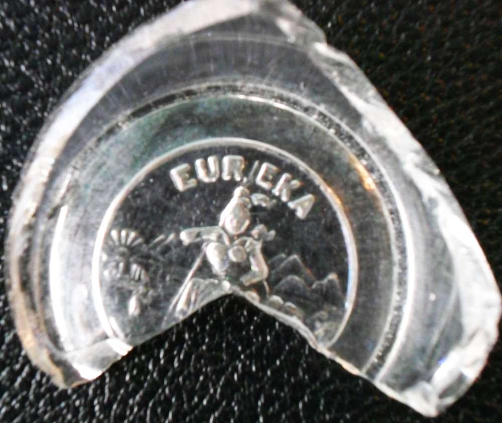 “EUREKA” design on shard. I have been intrigued by this shard for some time. I haven’t been able to find out ANYTHING about it, other than the fact it is a pressed-glass design based on the State Seal of California. The raised design appears “correctly” when looking down into the glass, but in reverse when looking at the bottom of the glass from outside.