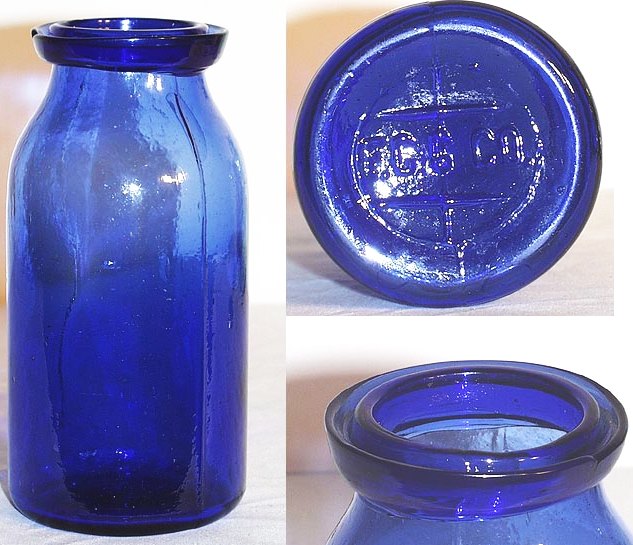 Their product most well-known to collectors would probably be the wax sealer fruit jar which is extremely scarce in a vibrant cobalt blue glass. (Another very scarce bottle made in a strong cobalt blue glass is the Hutchinson-style or “Hutch” soda bottle embossed “Geo Disbro /  & Co / Chicago” on the front.  The “F.C.G.CO.” marking appears along the lower heel).