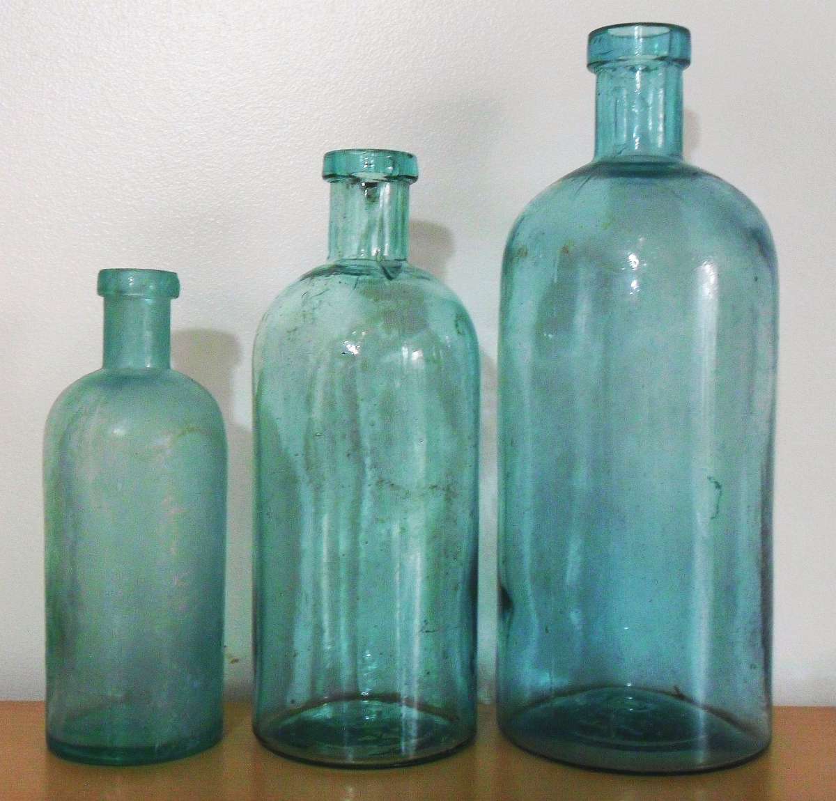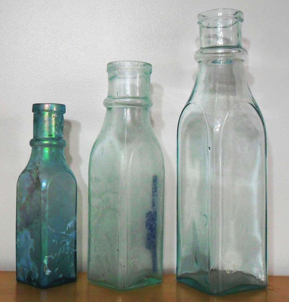 Group of three F.C.G.CO. "generic" chemical or "druggists' packer" bottles made by Falls City Glass Company, measuring 6 inches, 7.5 inches and 9 inches in height.