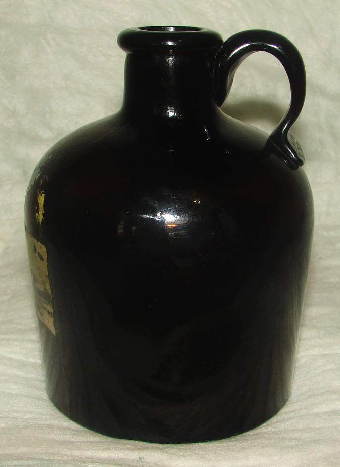 Falls City Glass Company ~  Dark amber jug with applied handle – marked F.C.G.CO. on base (photo courtesy of Kevin C.)