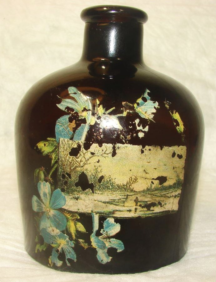 Below are photos of a very unusual dark amber jug with an applied handle.  One side of the jug features an enameled painted decoration.  Whether the decoration was done at the factory or by another concern is unknown.   The jug measures 5 & 1/8th inches in height and 3 & 7/8th inches across the base.  (Thank you Kevin for the photos!).