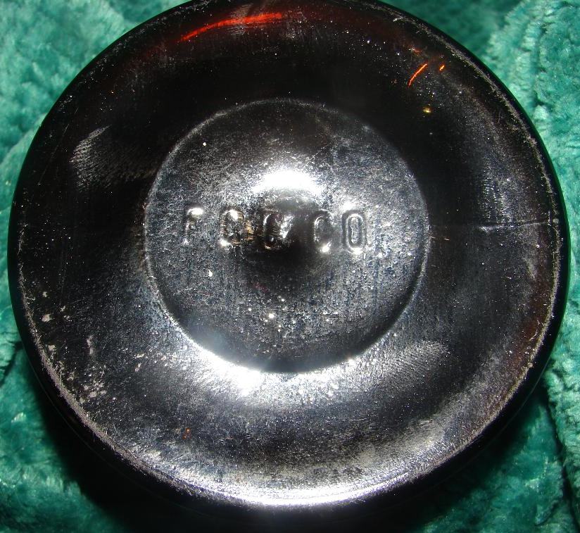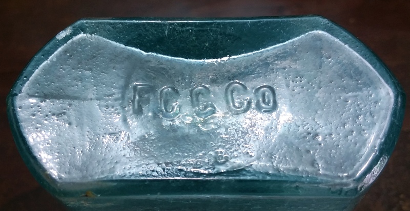 F.C.G.Co. mark on the base of an aqua half-pint “Coffin” or “Shoofly” style liquor flask (photo shown below).