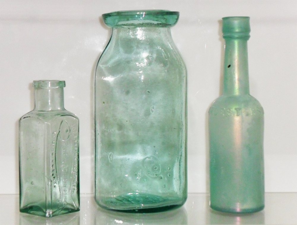 Left to right: JOSEPH GOLDBACH / PORPOISE OIL DRESSING / LOUISVILLE,KY. (shoe/leather dressing); Wax sealer type fruit jar; Worcestershire Sauce bottle, all marked F.C.G.CO. on base.