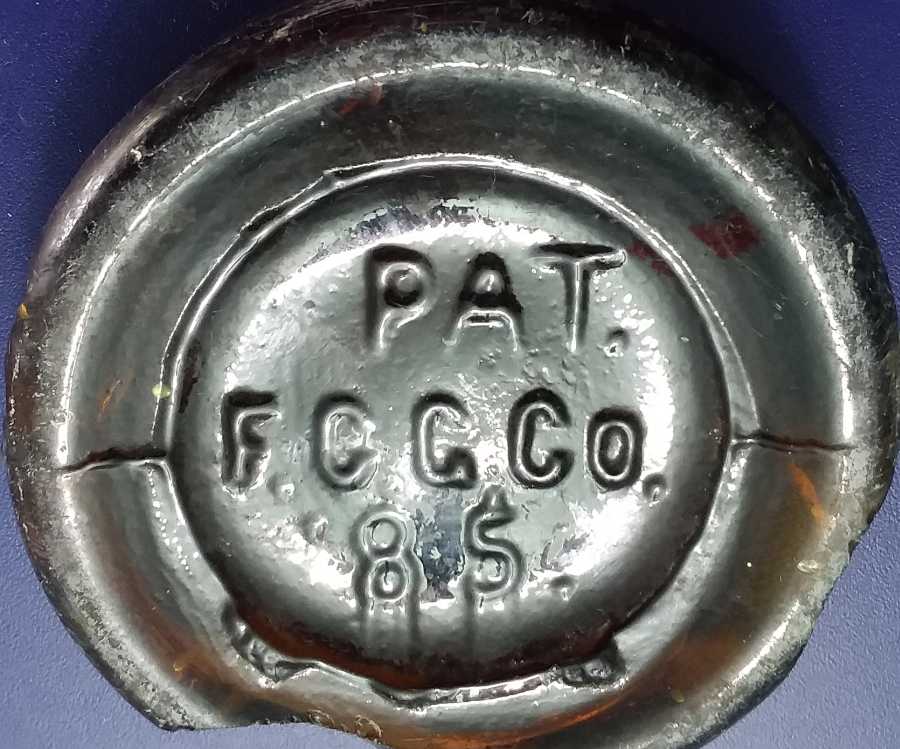 “F.C.G.CO.”  was the most common mark they used on their containers. The initials are seen embossed on the base of wax sealer-style fruit jars, pickle bottles, hock wines, coffin flasks, cylinder whiskey bottles,  whiskey “mini-samplers”, blob-top beers,  pepper sauce bottles, olive oils, generic Worcestershire sauce bottles, Hutchinson (“Hutch”)  style soda/mineral water bottles, shoe polish bottles,  cylindrical chemical bottles (sometimes called “Druggists’ Packers” in early glass factory catalogs) and a variety of other “generic” glass containers in common use during the late Victorian era.