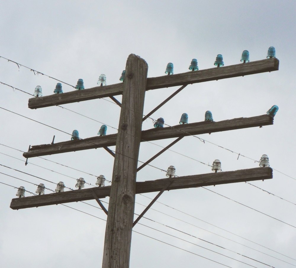 Old photos from around the U.S. show many telephone, telegraph and electric power poles sporting large numbers of insulators arranged on crossarms. Some telephone poles (in large cities) carried as many as 20 or more crossarms, each one bearing six, eight, 10 or 12 (or even more) insulators.