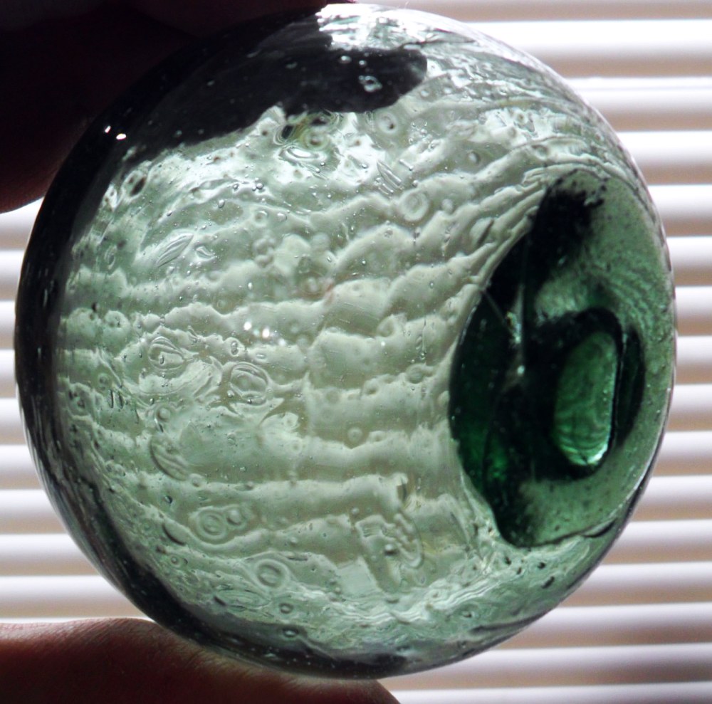 I don’t know what percentage of floats contain water but I’d guess it would be less than 0.1%. It is my understanding that the water has very, very slowly seeped into the float (while drifting on the open ocean) through tiny crevices in the glass, presumably cracks located along the perimeter of the sealed “button” or “cap” of glass (the molten glass cap having been added as a last step by the glassblower), as seen on handmade floats.