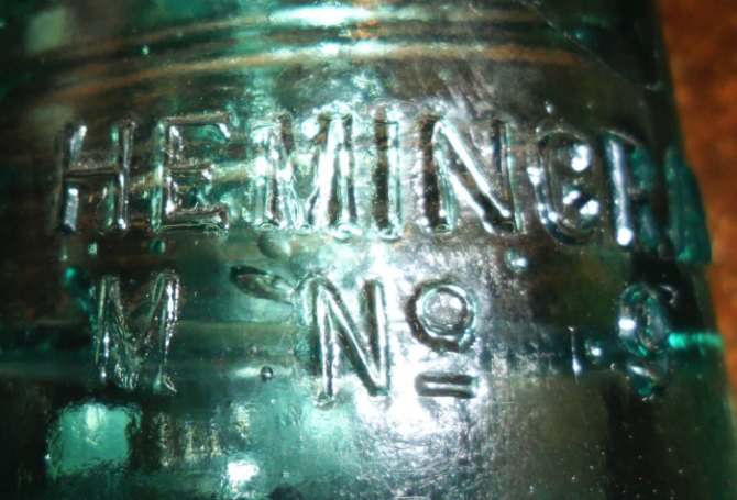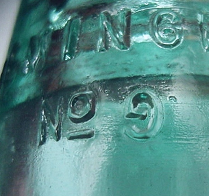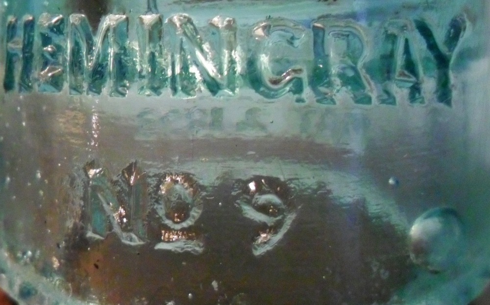 Other errors include the “HEMINGAY” misspelling error; a mold in which the name is spelled “HEMIGRAY“; a mold in which the “8” is double-struck; another mold in which the “R” is stamped twice; as well as a mold in which the “9” is double-stamped. In at least one mold, the “9” under the name HEMINGRAY is actually an upside-down “G” stamp. Another variant has a letter “M” placed to the left of “No 9”, probably resulting from the mold worker starting to engrave “MAY” on the second line, and then realizing his error.