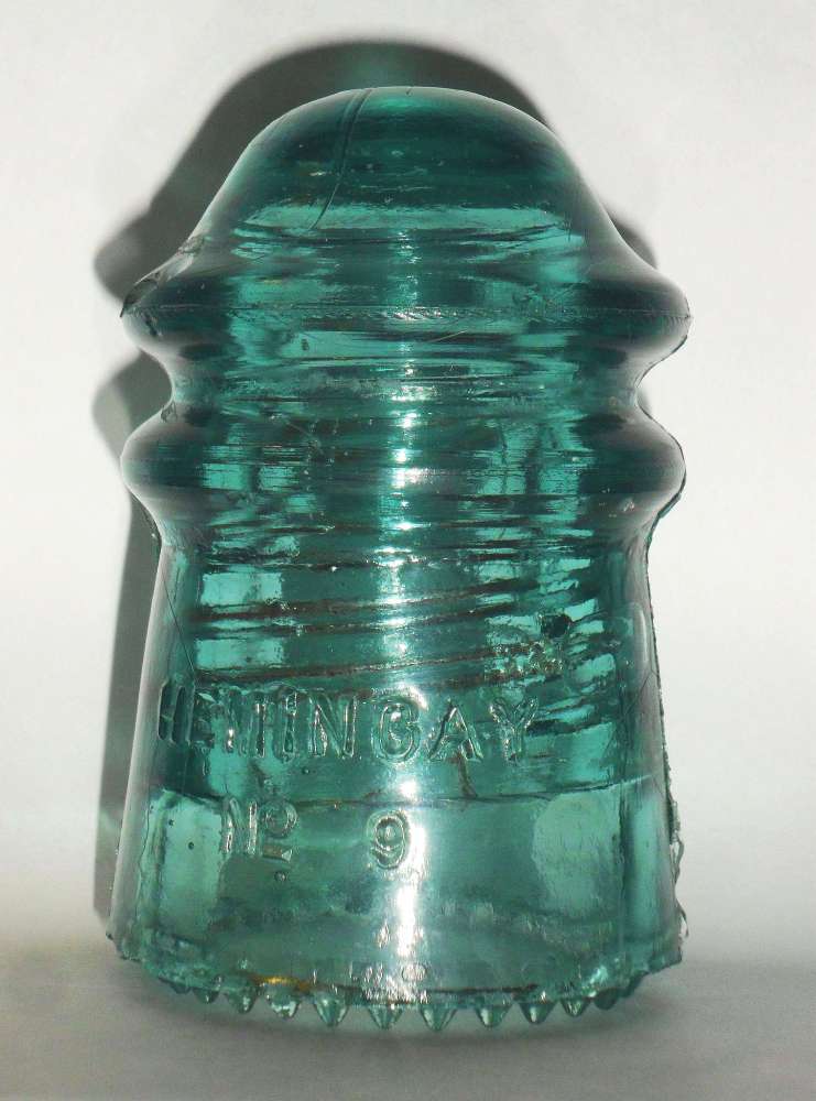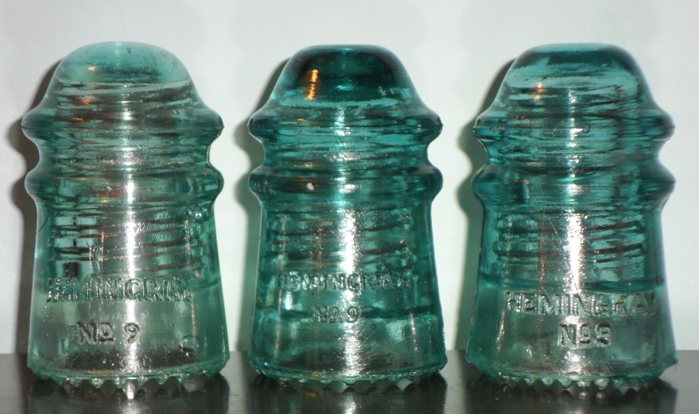 Most of the Hemingray No. 9 insulators were made at the Muncie factory (which had begun glassmaking in 1888) but it appears that their first factory location (at Covington, Kentucky, where business offices remained until 1919) was reopened for some period of time, perhaps 1900-1902, and quantities of the No. 9s were also made there. Judging from shards found along the Ohio River riverfront area, most of the Number 9s made at Covington appear in shades of light blue or blue-aqua, often with lots of bubbles, and are of the “Prismic” embossing variety.