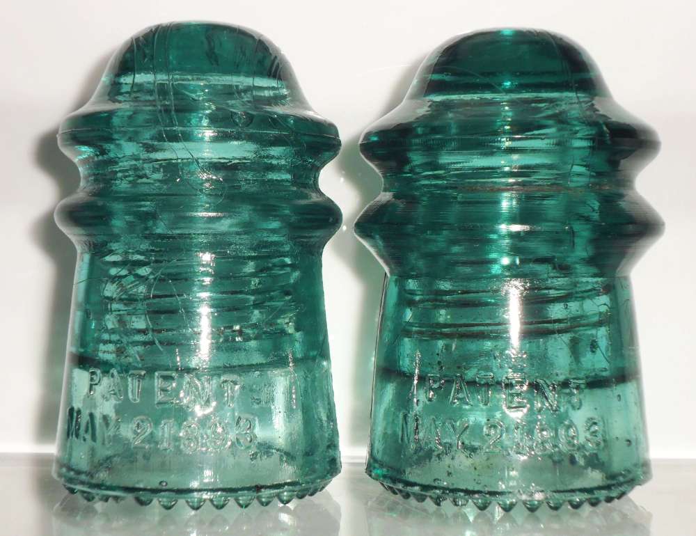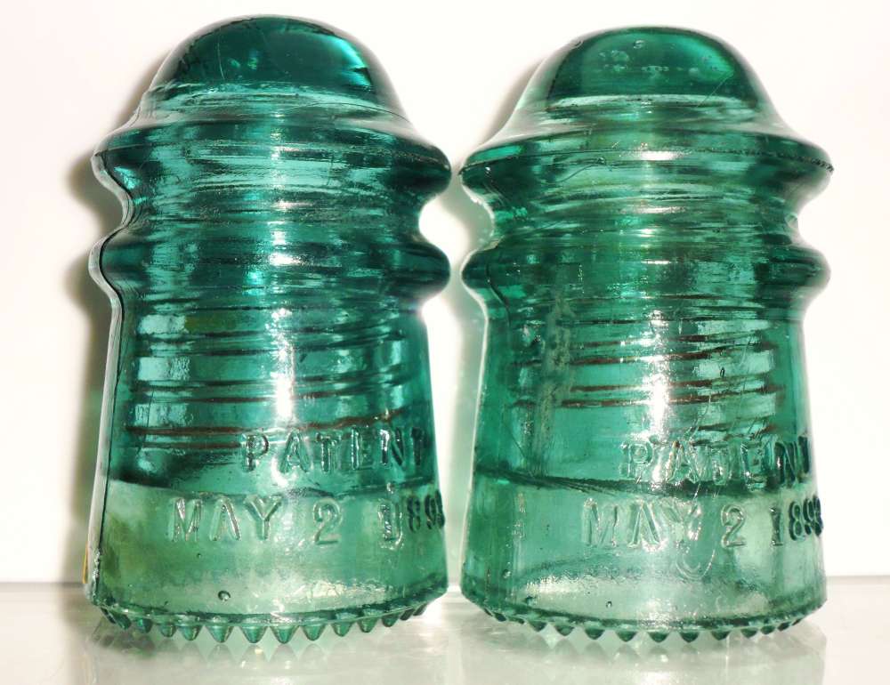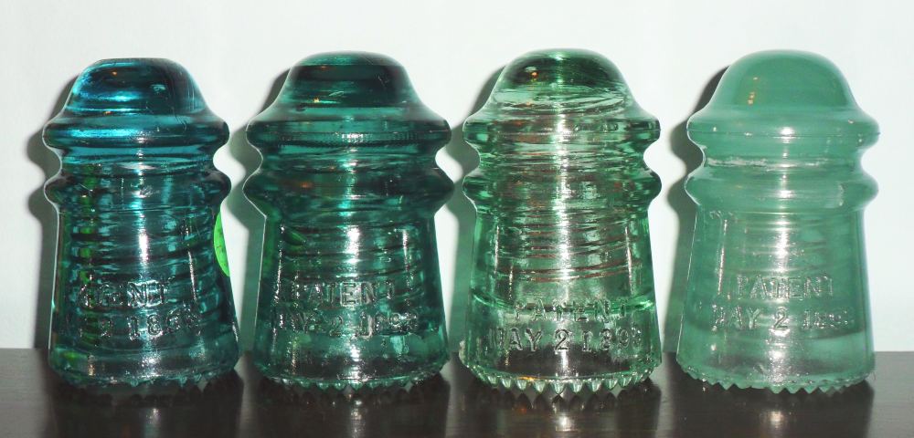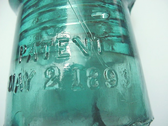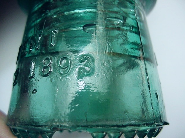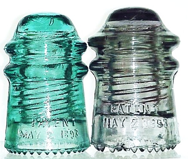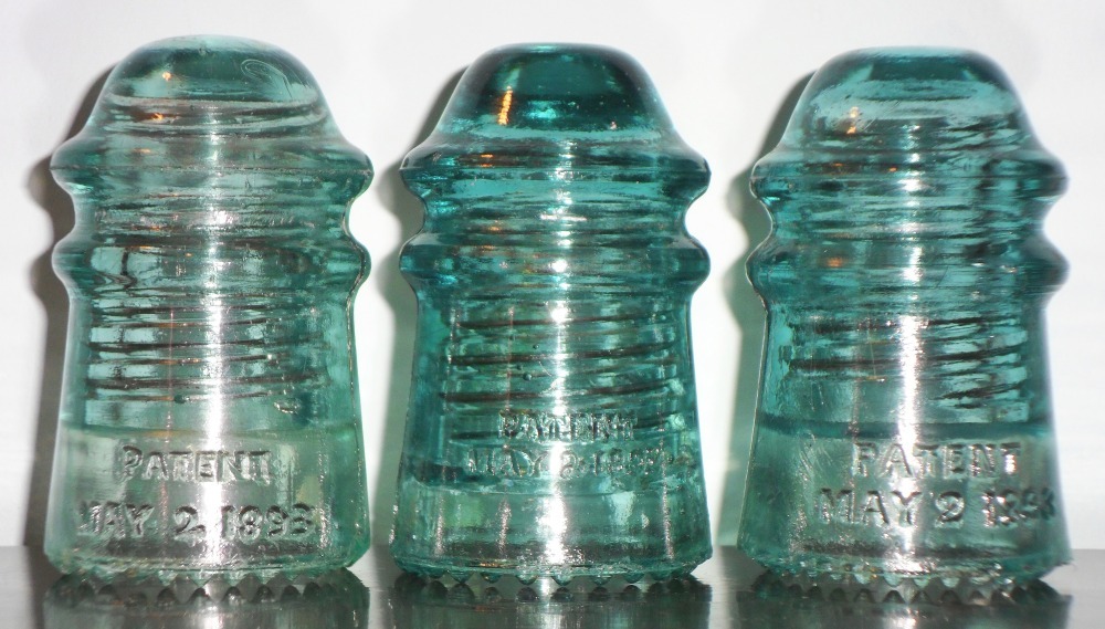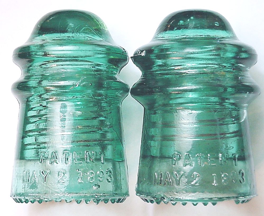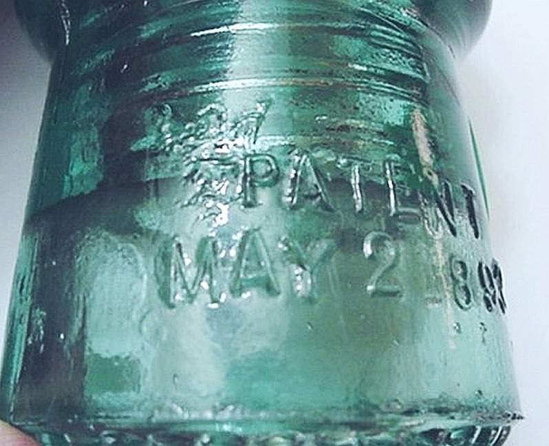 (Around 1910 the word PATENT was changed to “PATENTED” on the new molds. There were evidently some changes in the molds or molding process around that same time, as a close examination of the PATENT versus PATENTED molds will show that, in the great majority of cases of the PATENT molds, the threading (and resultant thicker glass) extends farther down toward the base of the insulator than on the PATENTED examples. With a little practice, the PATENT and PATENTED versions can usually be differentiated from several feet away, if one can clearly see the vertical extent of the threading.)