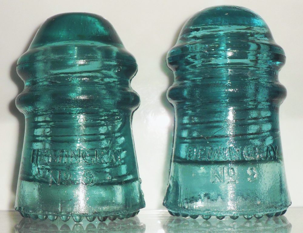 !["HEMINGAY / NO 9" error. This is listed as index [060]. There was evidently only one No. 9 mold with this particular engraving error. The other side also has an error: The "P" in "PATENT" was stamped over an "H". Hemingray No. 9 insulator -- "HEMINGAY" error. This is listed as [060]. There was evidently only one mold with this engraving error.](https://glassbottlemarks.com/wp-content/uploads/2024/04/Hemingay-error-CD-106-aqua-resized-222x300.jpg)