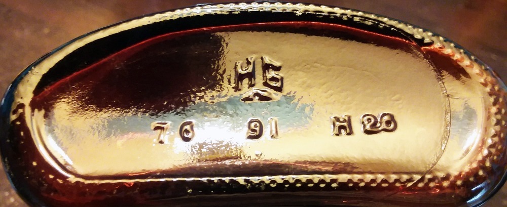 As of October 18, 1961,  the plant officially became the Hillsboro Glass Company, a subsidiary of Hiram Walker.  All, or nearly all, of the glass production consisted of amber bottles and jars.   The mark seen on the base of many of these containers consists of the letters “H” and “G” positioned over a somewhat “horizontally flattened” triangle.