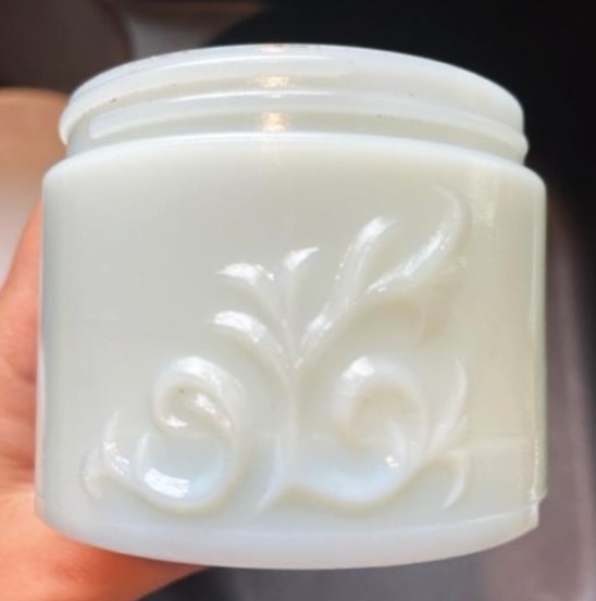 I just found an ad that shows Angelina Knapp’s jar with embossed leaf design. This jar has a metal white screw on lid. It identifies it as Granny Core 1950’s Milk Glass Vanity Jar Cold Cream HAND CREAM.
