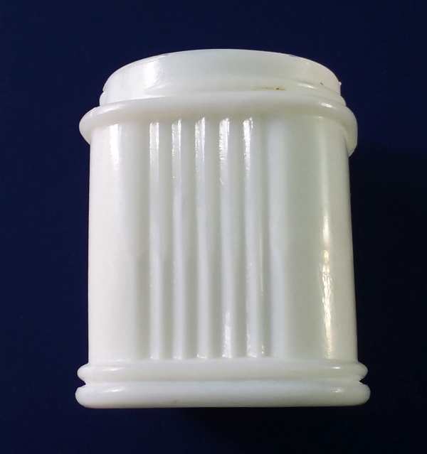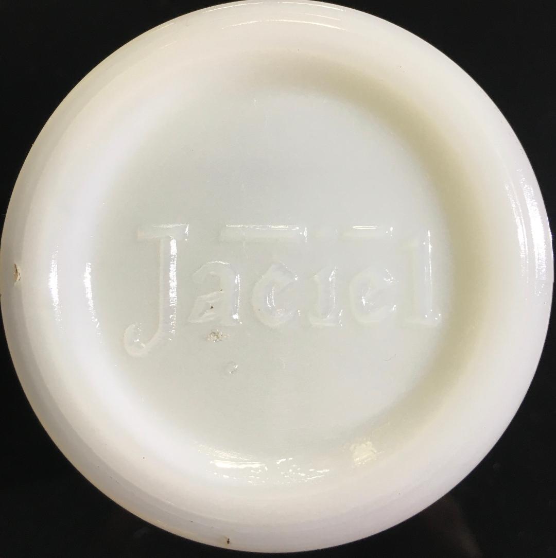Shown here (in the next two photos) is an unusual milk glass cosmetic jar (probably for cold cream, but possibly some other product) marketed by J.C. Penney. This is embossed with the name JACIEL on the bottom. The brand name “JACIEL” was used for a line of cosmetic products sold only through that department store. Judging from information on the following webpage, the Jaciel line was sold during the 1927 to 1934 time frame.