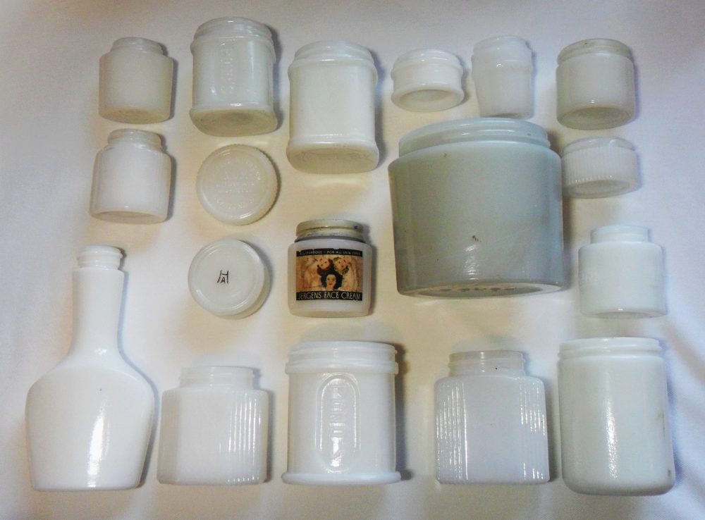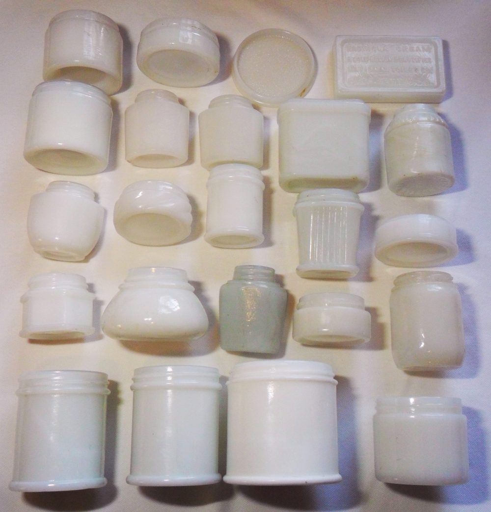 Here are some examples of vintage milk glass “utility” jars that held many types of products, especially creams (face cream, facial cream, peroxide cream, beauty cream, vanishing cream, baby cream) as well as other cosmetics, lotions, salves and ointments. Often, the bathroom and/or the lady’s bedroom dressing table would include a number of these kinds of jars at hand.