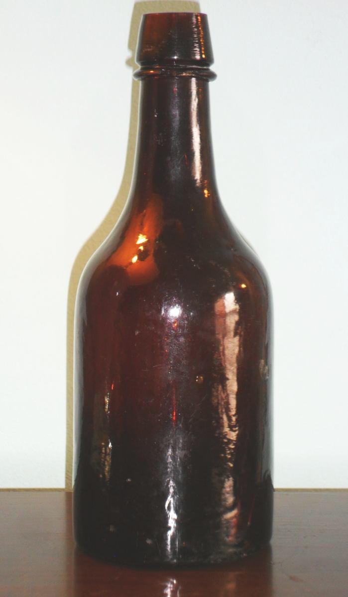 A dark red-amber quart ale-type bottle (shown) is confirmed to exist and bears the lettering “NEW ALBANY GLASS WORKS” embossed in a circle on the bottom. In addition, another variant of the same type of bottle is lettered “NEW ALBANY GLAS WORKS”, apparently as a result of a mold maker’s engraving error. An example of that bottle sold on ebay in February of 2018. I don’t know which variation is more common, but both seem to be very scarce.