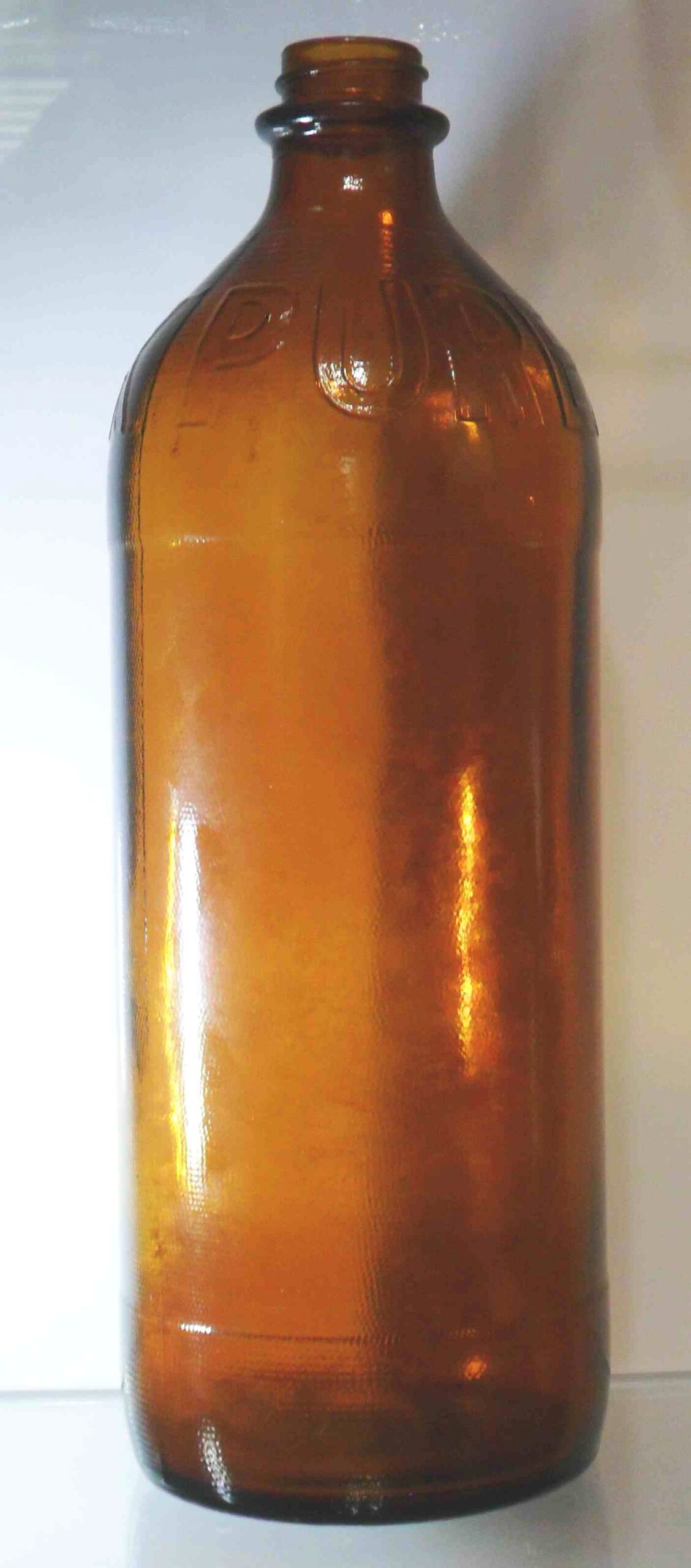I found a bottle buried with some old brick on our property. It’s a large, gallon-size, amber jug. There is an n in a square on the bottom with the number five just below it. There is a seam on each side of the bottle leading to a textured top of the body with a one-inch horizontal line halfway up on each side of the textured top. The spout has a finger handle and a screw-top mouth. There are no other markers to indicate what this bottle was for or when it was made? Any ideas?