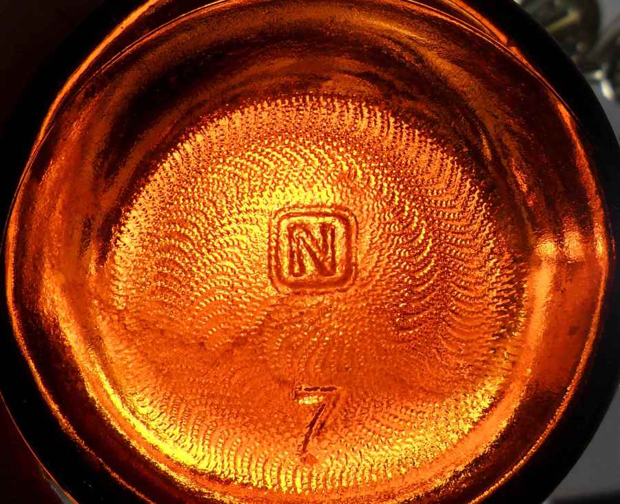 Some amber Orange Crush soda bottles are seen with the “N in a square” mark on the bottom. On beverage bottles, typically the logo is accompanied by a date code, usually two numbers located to the immediate right of the “N”, which would stand for the last 2 digits of the year the bottle was made. (However, on many NON-BEVERAGE bottles of various types, a single digit next to the logo is not a date code, but believed to be a mold number).